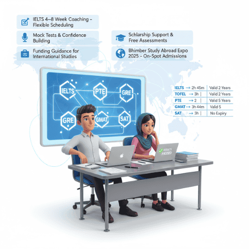 Students in Bhimber now have access to structured test preparation programs. These programs meet international education standards. We offer coaching for ielts pakistan, TOEFL, PTE, GMAT, GRE, and SAT, tailored for Pakistani students.