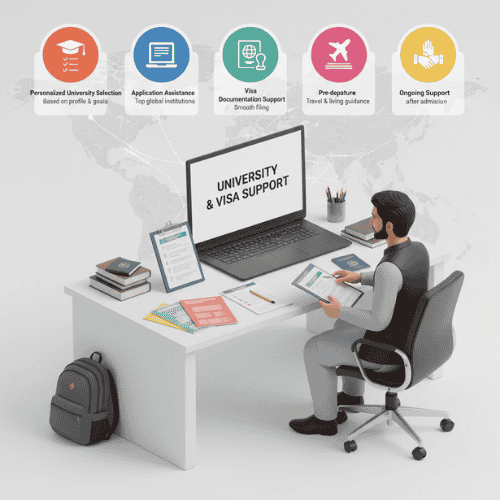 Every step is managed by skilled overseas education consultants who know international admissions well. We pay attention to every detail, from the first meeting to when you leave for abroad. This makes your transition smooth and easy.