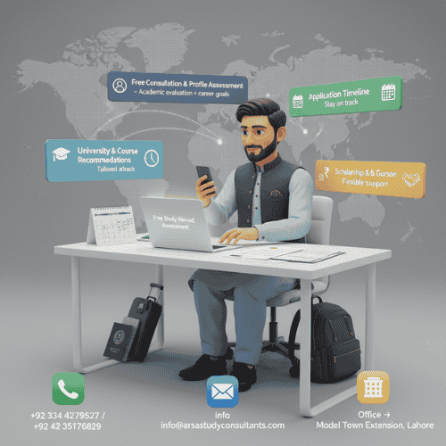 Starting is easy! Call us at +92 334 4279527 or +92 42 35176829 for help, or email info@arsastudyconsultants.com. We offer free consultations to plan your study abroad journey.Visit our office in Lahore or connect online to start your international education.