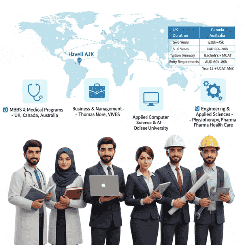 Students from Haveli AJK are keen on various academic programs for their study abroad plans. Our student guidance experts Haveli help pick the perfect course for your future goals and past studies. We offer detailed service for choosing programs and international university admission Haveli steps.