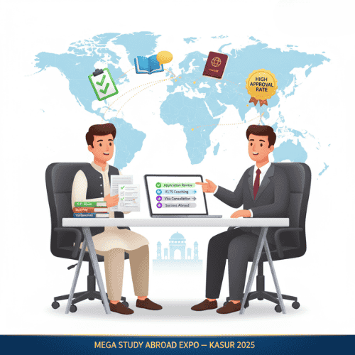 We act as your trusted study abroad agent kasur by creating plans for guaranteed visa approval kasur. Our strategy includes ielts coaching kasur, a detailed plan for free consultancy for student visa kasur, and ongoing visa consultation kasur. We’re known as the best consultancy kasur, guiding you through study visa kasur needs. We offer free sessions, regular updates, and a chance to join the mega study abroad expo kasur 2025.
