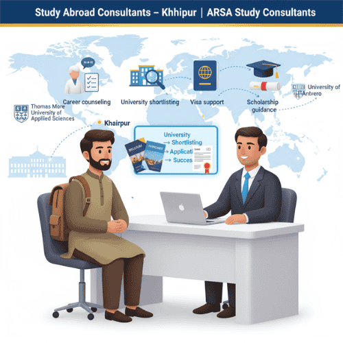 Start your international education journey today. Visit our Khairpur office for a free assessment. Discover how we can make your study abroad dreams a reality. With ARSA Study Consultants, your path to world-class education is clear and achievable