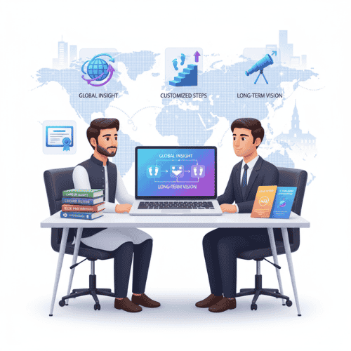 We start with free assessment sessions to understand your goals and budget. Our team then creates a roadmap for you. This includes choosing courses and filing for study visas in Khushab.