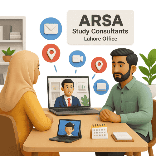 We are ARSA Study Consultants in Lodhran. Our goal is to help you understand universities, documents, and visa needs. Our Lahore office is here to support you every step of the way. Call us at +92 334 4279527 to start changing your future.