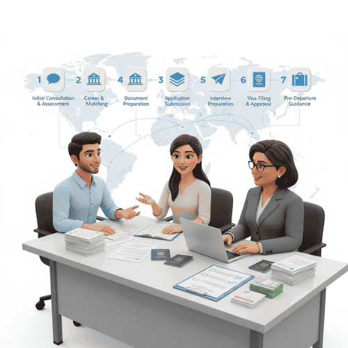 Our seven-step process includes consultation, career counselling, and university selection. We also help with document preparation, application, visa support, and final support. Each step is designed for your success.