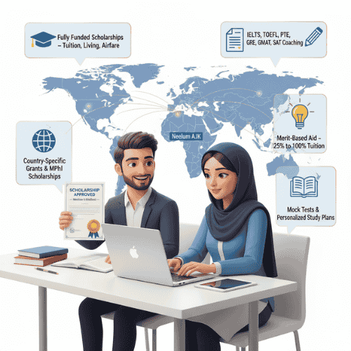 Going to school abroad can be expensive for students from Neelum Valley. Our scholarship support Neelum AJK services help you find funding. We also prepare you for important tests needed for your dream university.