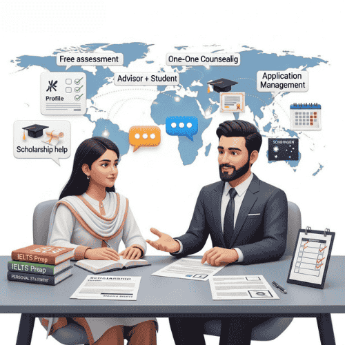 Our process begins with a free study abroad assessment in Rahim Yar Khan and IELTS prep. We ensure every step meets university needs, sorts out finances, and handles visa issues. We’re with you every step of the way, whether you’re getting a student visa or a Schengen study visa.