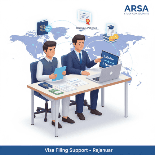 ARSA Study Consultants in Rajanpur offers direct support for your visa application. They help with filling out forms, paying fees, and scheduling interviews. Our team makes sure your documents meet all the requirements, reducing the chance of delays.